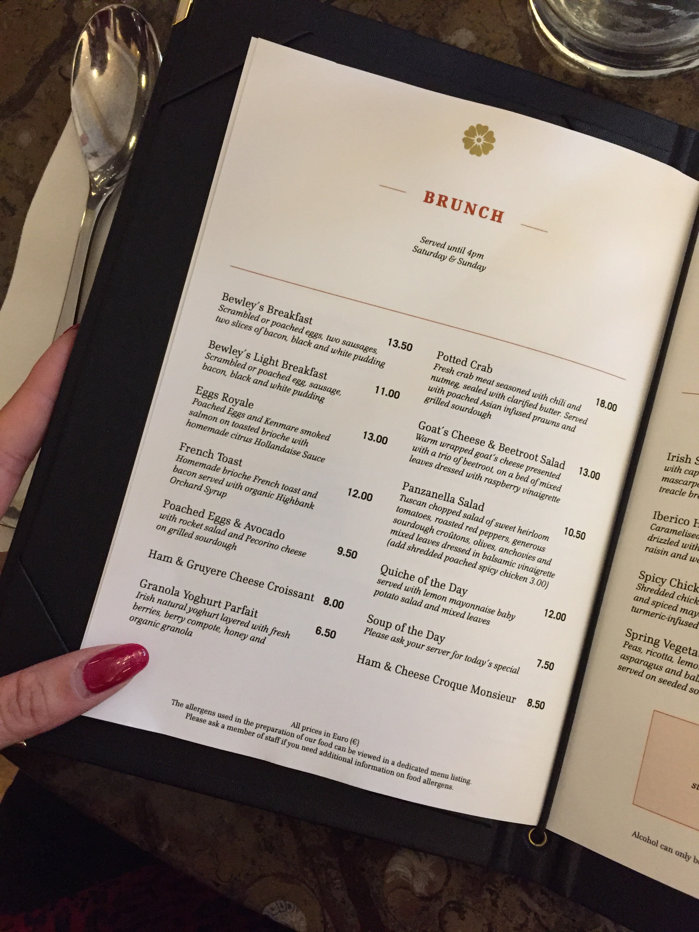 Welcomed by a selection of reception cocktails, of which I chose the Bellini (€8.50), we were seated in the beautiful James Joyce Room, which overlooks Grafton Street. Bright, atmospheric and comfortable, there are hues of forest green and sky blue from the three four-chair tables, as well as the old-style off-pink booths and the wooden chairs, surrounded by dark wood and the original dark green Oriental-patterned wallpaper – all of which are reminiscent of Bewley’s.