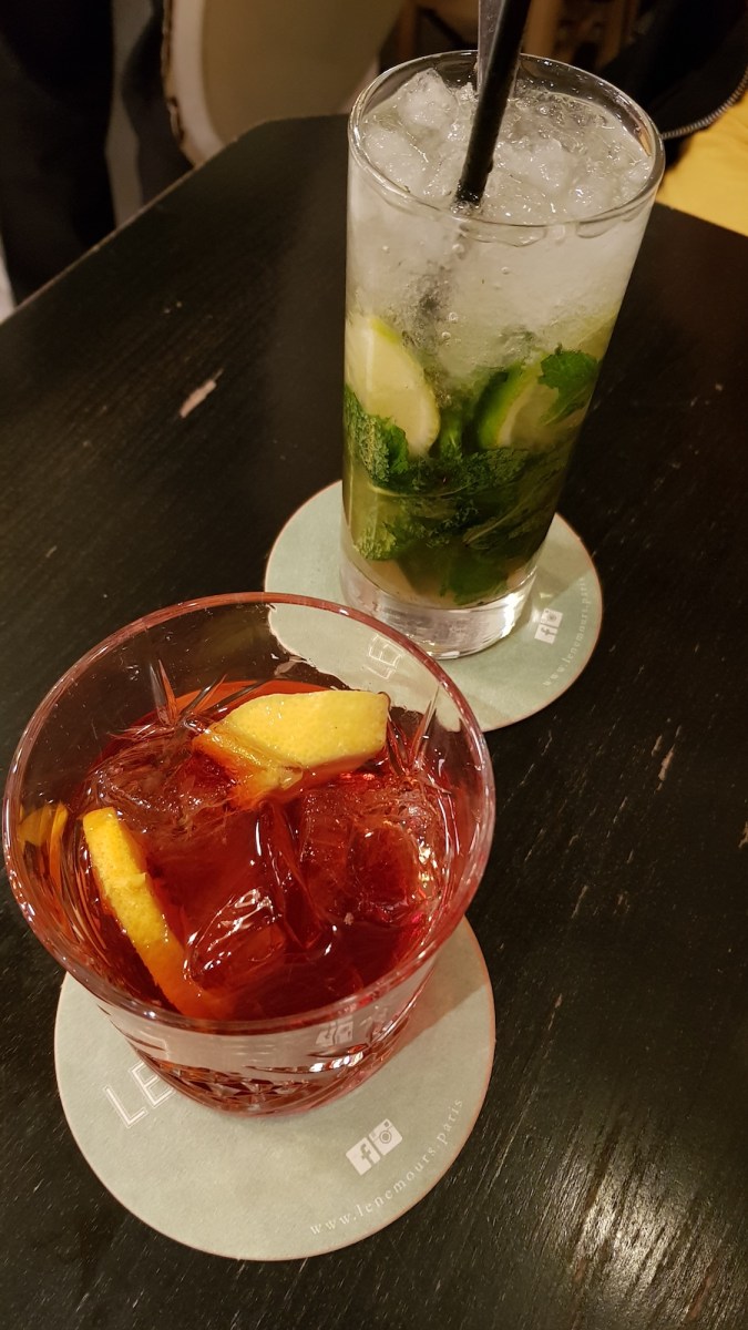 Le Nemours, Galerie de Nemours, 2 Place Colette, 75001 Paris: We visited Le Nemours for pre-dinner drinks, opting for a cocktail each. I had the Negroni (€12) while Lorna had the Mojito, sitting at a window table inside. Our drinks were lovely; my Negroni was strong how I like it, served in a classy tumbler glass. The service was good, with polite attentive servers.