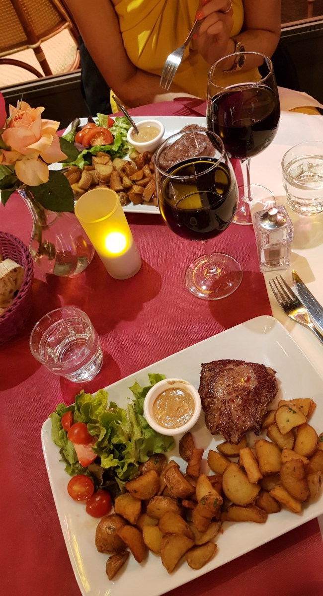 Café Saint Honoré, 194 Rue Saint-Honoré, 75001 Paris: Post drinks, we headed to Café Saint Honoré for a late dinner. Just down the road from the Louvre Metro stop, this nifty restaurant was still abuzz after 10pm. We nabbed a table beside their indoor Vespa, we each had the Rump Steak with a carafe of Merlot to share. I asked for my steak to be cooked rare, which it was, though Lorna’s had to be sent back to be cooked a little longer – our waiter was really understanding and friendly about it, and double checked with Lorna if it was better the second time. The mains were served with a peppercorn sauce, rustic fried potatoes and a dressed fresh salad. The flavour of the steak was delicious, soft and succulent, with a crusty sear. The peppercorn flavour needed a bit extra from pepper mill, while its consistency was slightly more butter than sauce. Overall though, it was a tasty and enjoyable meal.